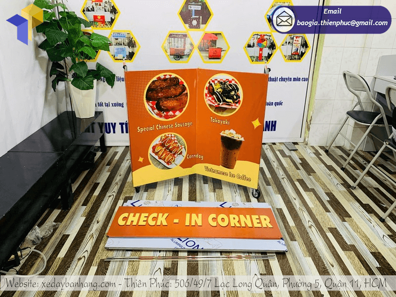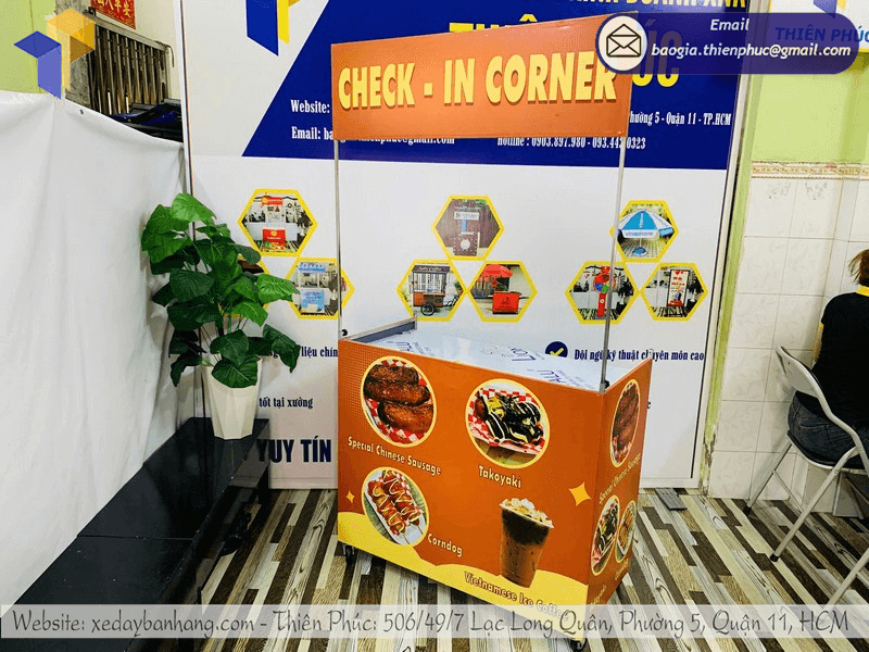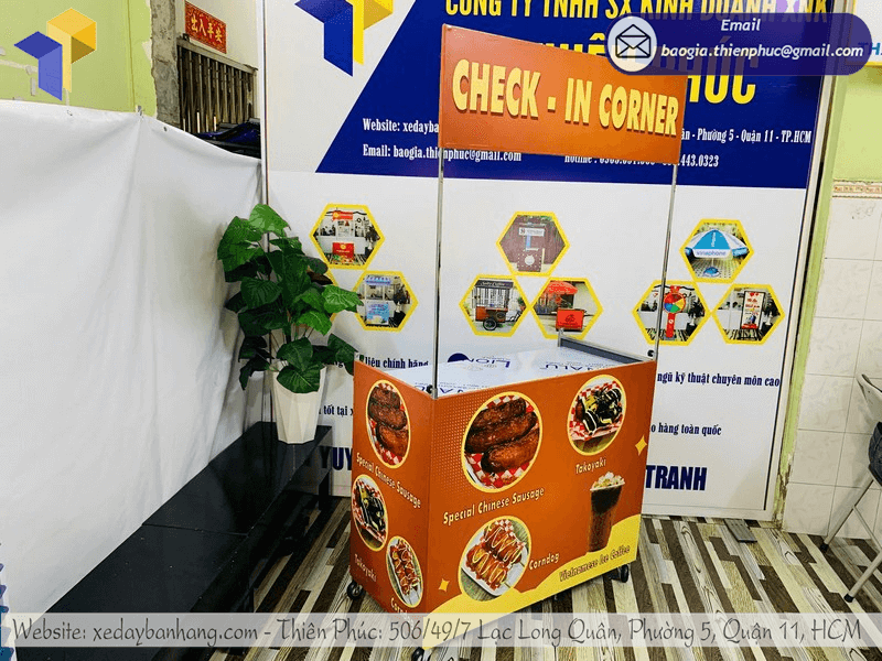 Quầy có thiết kế bánh xe chịu lực, dễ dàng đẩy đi khắp các vị trí: chợ, cổng trường, khu dân cư, công viên,...