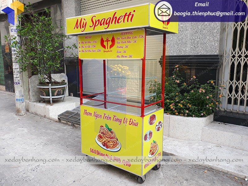 Quầy bán thức ăn nhanh lưu động hiện nay là một trong những mô hình kinh doanh nổi bậc nhất hiện nay, được nhiều người lựa chọn làm hình thức kinh doanh buôn bán thức ăn nhanh…. Với công nghệ tiên tiến như hiện nay thì có rất nhiều mô hình kinh doanh nhưng hình thức mà mang lại hiệu quả kinh tế cao là hình thức kinh doanh bằng những quầy xe đẩy bán hàng vì nó ít tốn nhiều chi phí trong sản xuất kinh doanh, không tốn tiền thuê mặt bằng hay nhân công nhưng vẫn giữ được mức hiệu quả doanh thu như một quán bán đồ ăn nhanh khác. Mẫu quầy bán “MÌ SPAGHETTY” đa dạng mẫu mã, kích thước, kiểu dáng sinh động bắt mắt thu hút tầm nhìn của khách hàng tiềm năng, quầy xe sinh động nhiều kiểu và thiết kế theo yêu cầu của khách hàng.