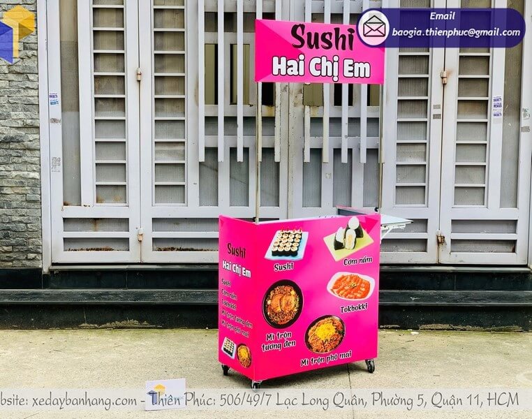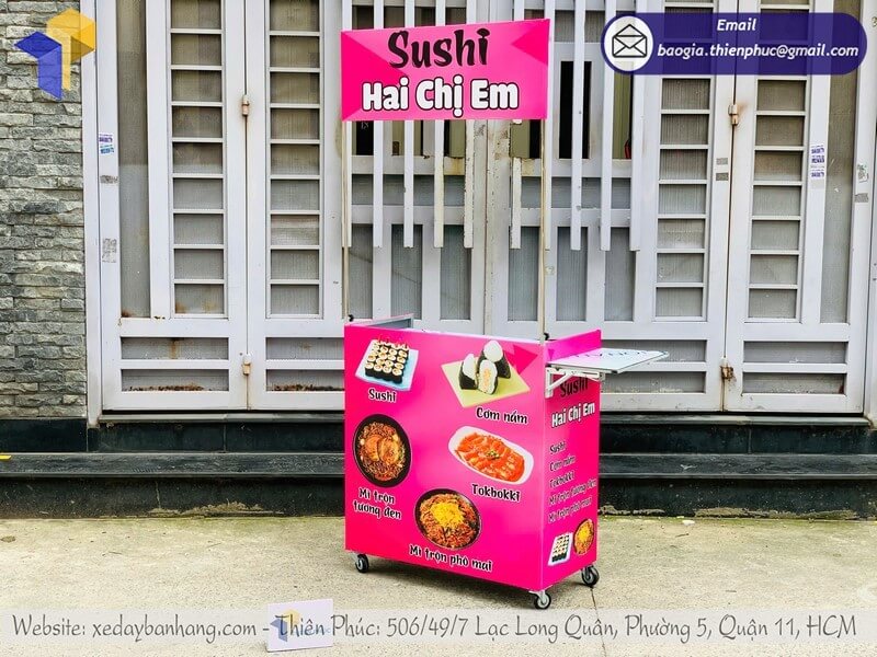 Có thể gắn thêm mái che, ngăn chứa, bánh xe chịu lực hoặc in logo thương hiệu trực tiếp trên xe để tăng sự nhận diện.